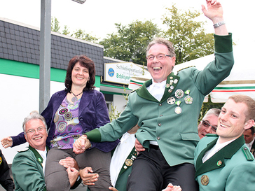 Beim Vogelschießen mit der großen Schwarzpulverbüchse setzte sich am Montagnachmittag Brudermeister Guido Joch gegen seinen Konkurrenten Frank Moses durch. Mit dem 168. Schuss gelang es ihm gegen 15.20 Uhr, den kleinen Rest des Holzvogels von der Stange zu holen. Der 47 Jahre alte König ist bei der Firma Bosch beschäftigt. In der Bruderschaft ist er seit 1982 und seit 2010 ihr Brudermeister. Er wird nun für ein Jahr gemeinsam mit seiner Frau Karin als Königspaar regieren. Königin Karin engagiert sich an den Schulen der Söhne in der Schulpflegschaft.