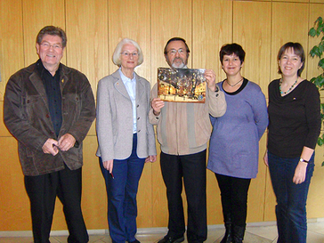 Jedes Jahr stellen die Lions einen Adventskalender vor. Hier die Ziehung der Gewinnzahlen anlässlich der Adventskalender-Gewinn-Aktion 2010. Von links nach rechts: Werner Köhl (Gründungspräsident des Lions Clubs Monheim am Rhein – Alte Freiheit), Hildegard Poduschnick (Präsidentin des Lions Clubs 2010/11), Friedemann Fey (Fotograf des Adventkalendermotivs), Kerstin Ludwig (Bayer Animal Health GmbH), Mireille Wittkowski (Lions Club). Foto: Lions